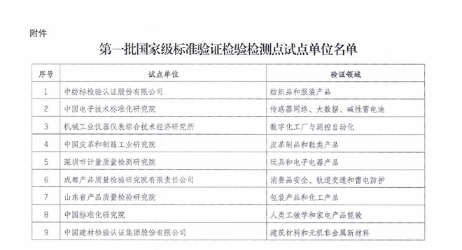 為貫徹落實《國家標準化體系建設(shè)發(fā)展規(guī)劃(2016-2020年)》(國辦發(fā)〔2015〕89號)中關(guān)于加強標準驗證能力建設(shè)、建設(shè)國家級標準驗證點的相關(guān)要求,做好標準驗證點建設(shè)工作,進一步探索標準驗證點工作模式和機制,國家標準化管理委員會委于2017年7月17日下發(fā)了《國家標準委辦公室關(guān)于下達第一批國家級標準驗證檢驗檢測點試點的通知》(標委辦綜合〔2017〕122號),批準了第一批20家國家級標準驗證檢驗檢測點試點單位,覆蓋電子、皮革、紡織、化工等領(lǐng)域,國檢集團負責建筑材料和無機非金屬新材料領(lǐng)域的驗證試點工作,將為相關(guān)標準制修訂提供標準驗證服務。