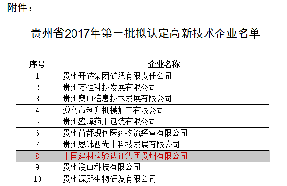 國(guó)檢集團(tuán)貴州公司于2017年8月10日作為2017年度貴州省第一批高新技術(shù)企業(yè)予以公示。