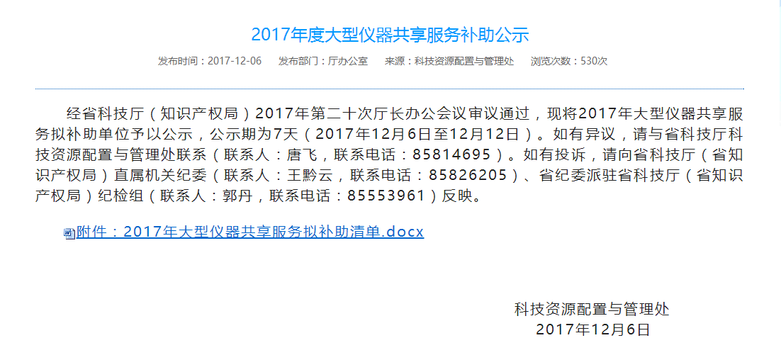 2017年12月6日,省科技廳發(fā)布關(guān)于2017年度大型儀器共享服務(wù)補(bǔ)助公示,中國(guó)建材檢驗(yàn)認(rèn)證集團(tuán)貴州有限公司獲10萬元補(bǔ)助。