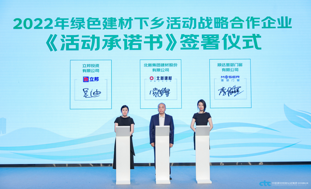 會上還發(fā)布了首批2022年綠色建材下鄉(xiāng)活動產(chǎn)品清單及企業(yè)名錄,正式啟動了綠色建材下鄉(xiāng)活動公共信息發(fā)布平臺及京東線上平臺,并對下一步工作進行了總體安排。國檢集團綠色建材產(chǎn)品認證客戶北新集團建材股份有限公司、立邦投資有限公司、順達墨瑟門窗有限公司的代表共同簽署了活動參與承諾書,承諾確保參加活動的產(chǎn)品及服務質量,積極配合開展綠色建材下鄉(xiāng)活動,充分發(fā)揮引領示范作用。